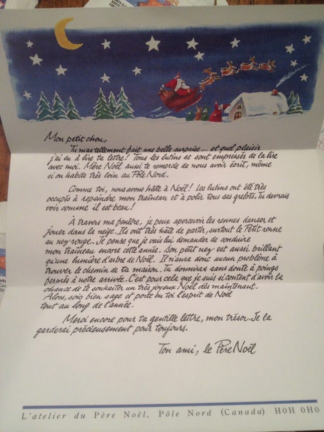 Year after year, my siblings and I would wait for our reply letters from Santa in the mail. When they finally arrived, we would rip them open and painstakingly read each word aloud, eyes twinkling with news of the elves busily working away in the workshop. Our little heads would nod solemnly when we read about how well Mrs Claus was keeping track of everyone to make sure that they didn’t forget anything before the ‘big day’. One year, 1995 to be exact, I opened my letter and began to read the first few words… “Mon petit chou, Tu m’as tellement fait une belle surprise… et quel plaisir j’ai eu a lire ta letter!” Quel horreur. Santa had sent me a little French Canadian girl’s letter. The corners of my mouth started to turn downwards and my little brown eyes widened in despair.