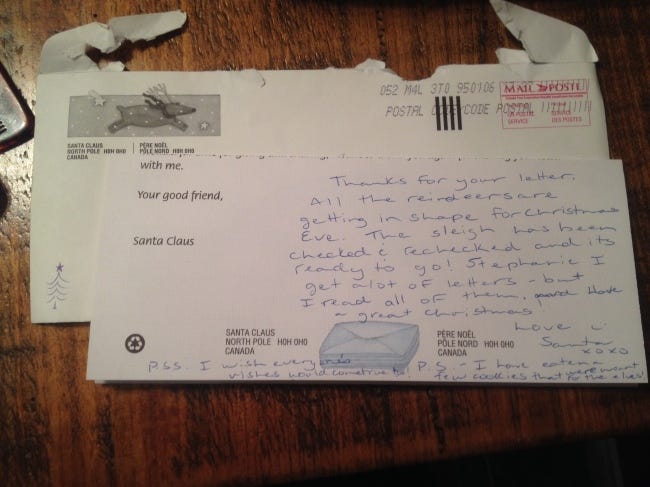 Thanks for your letter. All the reindeers are getting in shape for Christmas Eve. The sleigh has been checked and rechecked and it’s ready to go! Stephanie, I get a lot of letters – but I read all of them. Have a great Christmas! Love, Santa xoxo :) p.s. I have eaten a few cookies that were meant for the elves! P.p.s. I wish everyone’s wishes would come true too!