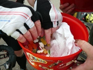 Justin finished the 7.2 mile swim in just 4 hours and 15 minutes, had a "quick bite" to eat and then went straight onto the bike. Now, knowing how much food IIIII need to eat after that amount of exercise, I couldn't imagine that anything less than a medieval feast would sustain someone over twice my size. Sure enough, on about the 3rd lap of 24 on the bike, Justin realized his nutrition had gone "badly wrong" and he lost an hour while he was catching up on some much-needed food! A few sleeping spells whilst peddling (and you thought nodding off while driving was bad) and a sore knee was all it took to make him look forward to that 75+ miles of running at the end.