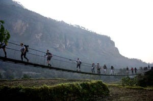 We crossed a couple of cable bridges today, which were stunning, but not for the faint of heart! We were not allowed to run on them, so I employed my best speed walk possible while ensuring that I never looked down. A surefire way to lose my 200 calorie breakfast on a fragile stomach! It was a long gradual uphill today for about 33 km, all on jeep track. We were following a fast-flowing river for most of the way and running through villages. Lots of encouragement from the locals. Throughout this race, I have been told by a number of young kids "you are number two boy!" which has been rather amusing. The race was advertised on the radio, so a number of villages were prepared. Yesterday, one of the villages even prepared a banner for us saying "welcome to all participant!" (sic) The police were out today as well, helping to point us in the right direction. It really feels like everyone came out today to push us along... and that helped.