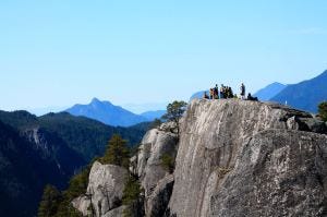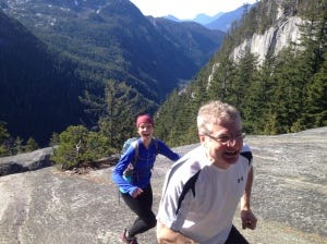 My favourite hike was with all of the 'boys' in my family up the Stawamus Chief (the "Chief") outside of Squamish. It rises 2300 ft above sea level and is considered to be the second largest granite rock in the world. It has three peaks, all of which are accessible and offer seriously wicked views of Howe Sound. Of course, in order to convince my Dad to join us, I may have downplayed the steepness of the hike or the fact that we would have to use ladders and ropes in order to summit the second and third peaks, but anyway :) (The photo above shows him sneakily racing ahead of me to the top - unfair head start!!)
