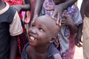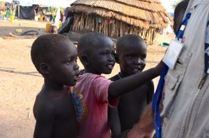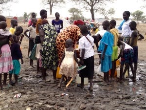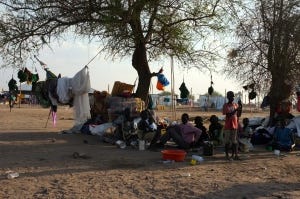 full speed and then stop about ten feet away as if there is a forcefield around me. I might as well be wearing a sign that says Please don’t feed the Kawadja! The reaction is always friendly and curious… unless we are talking about anyone under the age of about 2 or 3. They simply burst into tears at the sight of my fluorescent skin. It is amazing how peaceful it feels here. There are somewhere between 60000 and 80000 people displaced by the conflict in Bor who have fled here to Mingkamman and camped out in temporary locations along the Nile. Humanitarian actors are here assisting with access to shelter (aka plastic sheeting), water, food and services such as education and medical care, but it isn’t enough to meet the needs of the population. Sanitation is poor, to say the least. And with the rainy season looming, it will only get worse. We are all temporarily stationed on low-lying areas, which will likely flood in the coming few weeks, requiring at least 50,000 people to move a few kilometers inland to a new site that is currently being developed. It is a race against the weather gods and we aren’t yet sure if they will be kind.