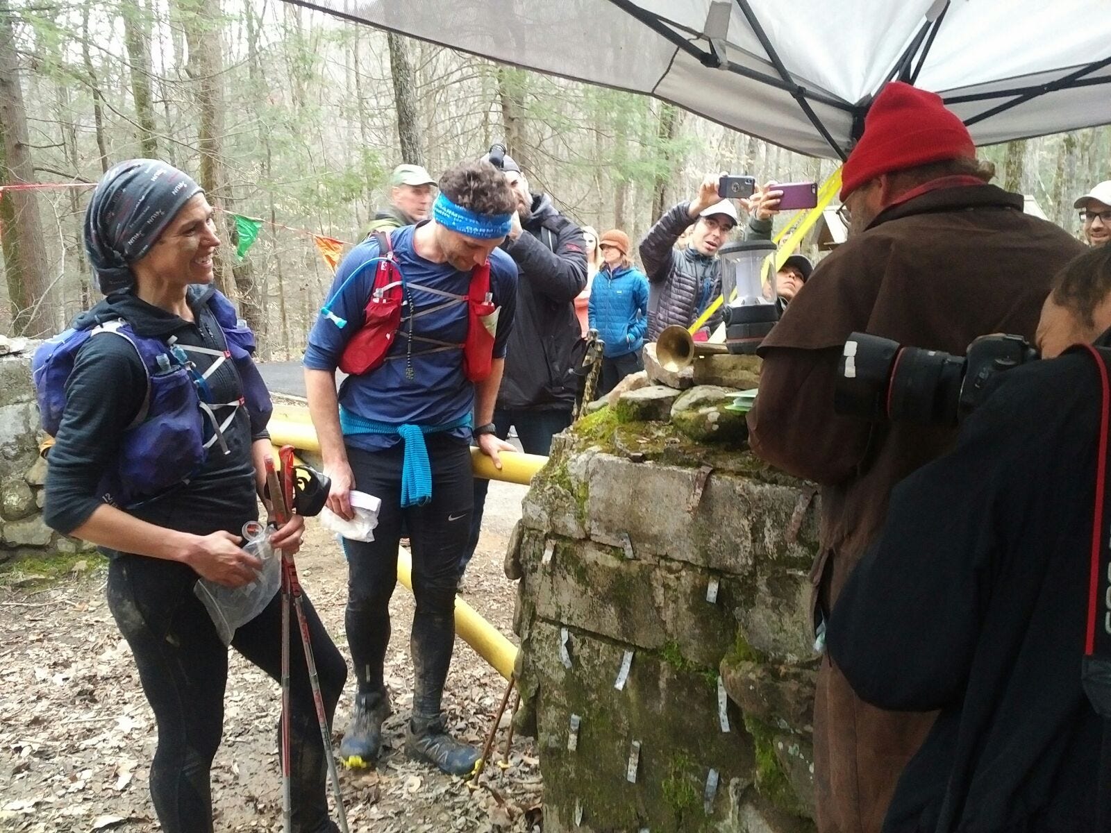 "Nimble hands! Can you just help me stuff my arm into my backpack? That's it. Perfect." Gareth, a South African Barkley virgin, gently lifted my left arm and tucked it next to my chest underneath the strap of my Salomon bag, Kilian-style. I didn't feel a lick of pain until about 30 minutes prior at Garden Spot when we all decided to drop - at that moment, I suddenly became aware of all of the aches and pains I didn't realize I had. We met Gareth after the coal ponds on the way up to Garden Spot. Still on loop one, Gareth had gotten lost amongst invisible horses on Stallion Mountain and was trying to find his way back to camp. He was surprisingly cheerful and his hands still worked, despite not having any gloves, which was a huge asset at that point. We told him to come with us to the next book, after which point I promised to show him the turnoff to quitters' road. By the time we got to the book, the rain had turned to sleet and snow, and the appeal of personally escorting Gareth back to camp was intoxicating. I hated myself for thinking it and even more for wanting it, but I knew it was my last chance to make it back to camp. If I continued to the next book, there was no turning back. Ugh. I am not even going to try to discuss whether this was the right decision or not. It often feels like the right decision at the time and the wrong decision after, but in this case, it felt like the wrong decision from start to finish. But it was the decision I made, and I was - am - going to have to accept it. I hadn't peed in hours and when the pain set in, so did the realization that my bladder was full. However, my ice claws were incapable of pulling my pants down and that was one job I wasn't going to ask of Nimble Hands (at least not without a proper dinner first to get acquainted). The four of us ran the long way down quitters' road to camp, where we knew Laz would be waiting. "Who is it?" he asked as our head torches bobbed and weaved closer. "Ugh, people you don't want to see," I replied. "I don't want to see myself." I was dejected to say the least and couldn't hold back the tears as we got tapped out, one by one. I was the first woman in off of loop one and had gone out with high hopes on loop two. And I had failed. What's worse, I had quit. I had messed up on something that was totally within my control, and it was my fault. Not only that, but I felt like I had messed up Billy's and Nicky's races too. If I had toughed it out, I'm sure they would have kept going. Furthermore, if I hadn't pushed them to rush out on loop two in under the 12 hour limit, they might have taken more time to put on more warm clothes. "I regret that you couldn't have suffered longer out there," said Laz. I had never felt more relieved or angry to be back at the yellow gate.