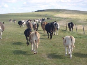 Sigh. Next I tried the barber shop. "South Downs Way? Hmmm. Well, if you go up to the roundabout, take a right, you'll see a little church. Take the path winding down beside the church, past the football field, and towards the bridge. Go under the bridge...." I tuned out. Heavens, I'll just start walking, I thought. After ploughing through some fields in what I figured was a sensible direction, a local berry picker told me my best bet was to take a left at the cow shed. Thirty minutes later I found myself covered in spiky burrs and stuck with the choice of walking through waist-high grass amongst a field of cows (and bulls??) or crawling through barbed wire to get to a footpath near a river. I choose the barbed wire.