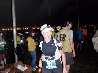 I let myself start thinking about victory around 95 miles, which was a MISTAKE. After chattering away about the race doors that might open with a first place finish, Cat reminded me to STICK TO THE PLAN. I said, yeah, I guess it doesn't matter how fast I was going if it was in the wrong direction. Priority #1: don't get lost. Just at that moment we passed a glow stick and I looked behind me - wait, there was another path going up the hill! We were so busy talking about passing Jill that we just about missed a turn! That would have been disastrous!!!!